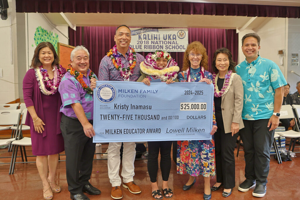 HONOLULU – Kalihi Uka Elementary School Kindergarten teacher Kristy Inamasu became the latest recipient of the prestigious Milken Educator Award on Tuesday at a surprise assembly with the entire school. Regarded as the “Oscar Award of Teaching,” the award recognizes exceptional teachers and comes with an unrestricted $25,000 cash prize.
