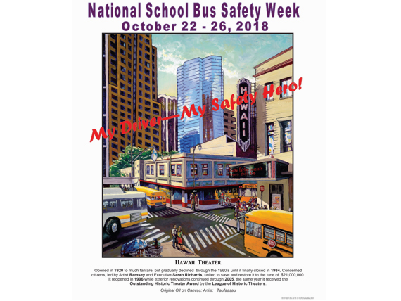 A special School Bus Safety Week poster created by Hawaii artist Hank Taufaasau will be on display and posted at school campuses statewide. For more information about the National School Bus Safety Week, please click here.